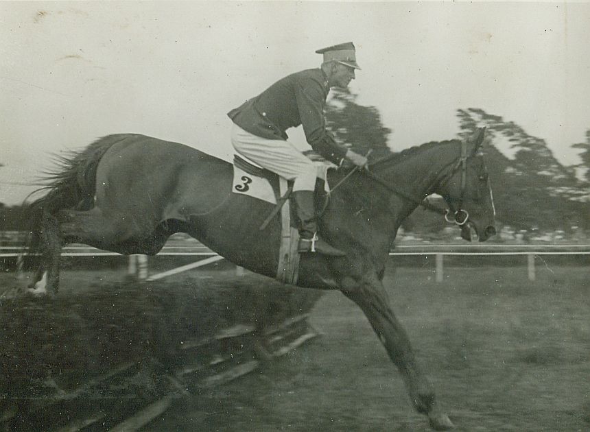 | Nr. inwentarzowy: MŁJ-XVI 1746 / 00 / 065 opis: Tor wyścigów konnych, Steeple-chase im. Pierwszego Marszałka Polski Józefa Piłsudskiego. Michał Bohdanowicz (białe bryczesy, kurtka i czapka mundurowa) na koniu Bakarat w próbnym skoku. Na potniku numer 3. W tle bariera, drzewa. Marszałek Piłsudski był honorowym prezesem Wileńskiego Towarzystwa Wyścigów Konnych i zgodził się na nazwanie wielkiego wileńskiego Steeple-chase swoim imieniem. Jeźdźcy walczyli o 5.000 zł i nagrodę honorową ofiarowaną przez Piłsudskiego.czas powstania - daty graniczne: 1936-07-12 - 1936-07-12miejsce: Wilno, Pośpieszka.osoby: Rtm. Michał Bohdanowicz "Miś" (1903-1948), 13 p.u., dowódca 1 szwadronu "Tatarskiego".tworzywo: papier fotograficzny, błyszczącytechnika: odbitka żelatynowo-srebrowa DOP, czarno-białazespół: album rodziny Leskichwymiary (wys. x szer.): 84 x 112 [mm] Koń: 1. Bakarat, ogier, rasa: xx, maść kasztanowata, ur. 1925 - (od 1934 wałach), Harsona – Balata, hod. Romana Czaykowskiego, wł. K. Dzierzbickiego, później Z. Cierpickiego. Startował w l. 1927-1937 w gonitwach płaskich, płotowych i przeszkodowych (prawie 100x, 1/3 zwycięstw) na torach w Baranowiczach, Łodzi, Wilnie, Bydgoszczy, Poznaniu, Kielcach, Radomiu, Lublinie, Warszawie. Dosiadali go: M. Bohdanowicz, por. Kwieciński, j. Ustinow, j. Gajewski, dż. Kucharski; trenerzy: S. Kowalski, Z. Cierpicki, S. Balcer, M. Bohdanowicz.