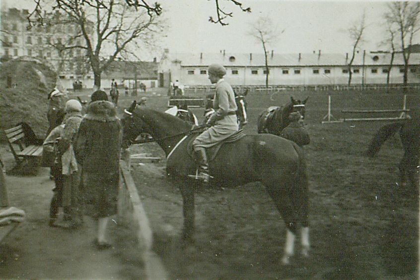 | Nr. inwentarzowy: MŁJ-XVI 1744 / 00 / 037 opis: Fragment ujeżdżalni Szwadronu Sztabowego, na niej przeszkody. Konie pod jeźdźcami i w ręku, na pierwszym planie Anna Leska na stojącym koniu Mandaryn. Kobieta w jasnym stroju treningowym, koń z odmianami na tylnych nogach. Z lewej ławki i stojący kibice. W głębi stajnie i kilkupiętrowa kamienica.czas powstania - daty graniczne: 1931-05-01 - 1931-05-31miejsce: Warszawa, ujeżdżalnia Szwadronu Sztabowegoosoby: Anna [Anka] Leska (1910-1998)tworzywo: papier fotograficzny, błyszczącytechnika: odbitka żelatynowo-srebrowa DOP, czarno-białazespół: album rodziny Leskichwymiary (wys. x szer.): 30 x 41 [mm] Koń: 1. Mandaryn, wałach, maść kasztanowata, ur. 1920 - hod. NN, wł. Niny Słaboszewicz; oprócz właścicielki dosiadała go Anna Leska