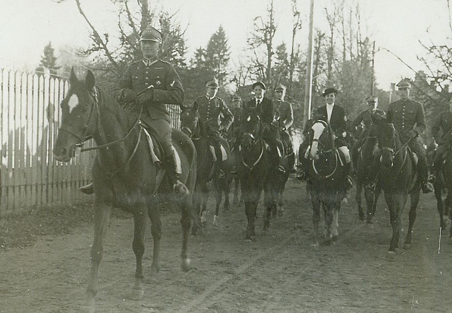 | Nr. inwentarzowy: MŁJ-XVI 1747 / 00 / 008 opis: Bieg św. Huberta w 13 p.u. – wyjazd na start. Grupę oficerów i pań prowadzi rtm. Michał Bohdanowicz na wał. Biedny. Koń z dużą latarnią na głowie to Talar III pod Wandą Bohdanowicz. Oficerowie w mundurach, kobiety w galowych strojach jeździeckich. Konie w rzędach sportowych, ogłowia wędzidłowe. Grupa jeźdźców jedzie stępem ulicą.czas powstania - daty graniczne: 1937-10-31 - 1937-10-31miejsce: Nowo-Wilejka.osoby: Rtm. Michał Bohdanowicz "Miś" 1903-1948 (w 1937 r. 13 p.u., dowódca 1 szwadronu "Tatarskiego"); Wanda Bohdanowicz 1908-1991 (córka Juliusza Leskiego i Marii zd. Olszyńskiej, od 1932 r. żona Michała Bohdanowicza).inne nazwy własne: Nowa Wilejkatworzywo: papier fotograficzny, błyszczącytechnika: odbitka żelatynowo-srebrowa DOP, czarno-białazespół: album rodziny Leskichwymiary (wys. x szer.): 59 x 83 [mm] Konie: 1. Biedny, wałach, maść kasztanowata - koń M. Bohdanowicza, który startował na nim w konkursach skoków i biegach myśliwskich. 2. Talar III, wałach, maść kasztanowata - hod. Bogumiła Hebanowskiego; ur. przed 1928, prywatny koń Michała Bohdanowicza, który startował na nim w konkursach ujeżdżenia, skoków (np. Mitingi Popularne PZJ 1938-39 i WKKW ("Militari"), biegach myśliwskich, skiringu, uczestniczył w ćwiczeniach wojskowych. Dosiadała go też żona Michała - Wanda (m.in. w 1937 r. w Grudziądzu)..