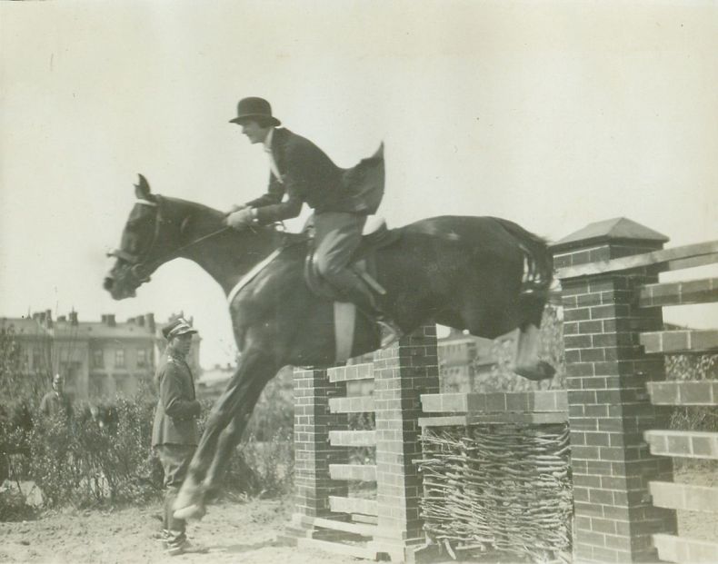 | Nr. inwentarzowy: MŁJ-XVI 1753 / 00 / 151 opis: Konkurs wewnętrzny Klubu Sportowego Rodziny Wojskowej na ujeżdżalni W.S.Woj. Janina Słaboszewiczówna skacze na koniu Mandaryn przez przeszkodę - wiklinową bramkę. Obok stoją żołnierze, w tle zabudowania.data: w albumie: maj 1930 r., ale zawody odbyły się w połowie czerwcaczas powstania - daty graniczne: 1930-06-14 - 1930-06-15miejsce: Warszawa, ul. Koszykowa 79, Wyższa Szkoła Wojenna, ujeżdżalnia położona w kwartale: Koszykowa – Krzywickiego/Sucha – 6 Sierpnia/Nowowiejska – Topolowa/Al. Niepodległościosoby: Janina Kirn-Słaboszewicz 1910-1975 (Nina, Ninula, po mężu Lipkowska, ziemianka, amazonka startująca w konkursach, uczyła się śpiewu operowego).inne nazwy własne: W.S.W - WSW - W.S.Woj. - Wyższa Szkoła Wojennatworzywo: papier fotograficzny, błyszczącytechnika: odbitka żelatynowo-srebrowa DOP, czarno-białazespół: album rodziny Bohdanowiczówwymiary (wys. x szer.): 87 x 114 [mm] Koń: 1. Mandaryn, wałach, maść kasztanowata, ur. 1920 - hod. NN, wł. Niny Słaboszewicz; oprócz właścicielki dosiadała go Anna Leska