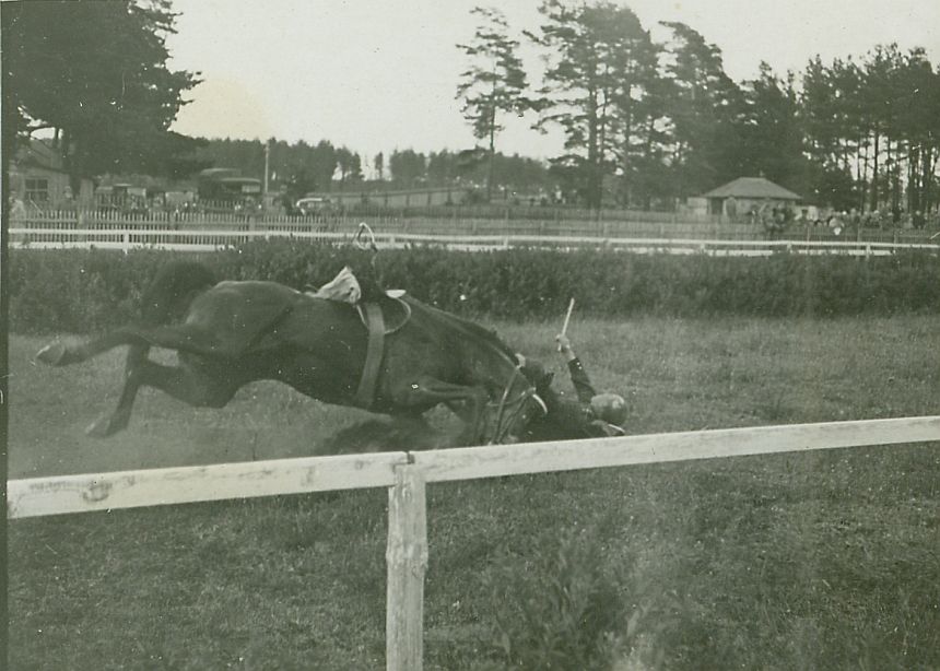 | Nr. inwentarzowy: MŁJ-XVI 1747 / 00 / 080 opis: Tor wyścigów konnych - wojskowa gonitwa z przeszkodami Woropajewa (dobra Przeździeckich, obecnie Białoruś, obwód witebski, rejon postawski). Upadek rtm. Konstantego Kalinowskiego z klaczą Bagatela po skoku trybunowym. Jeździec leży, koń upada. Mimo upadku para zajęła II miejsce. Wygrał koń Sortilège pod por. Mieczysławem Chilińskim.czas powstania - daty graniczne: 1938-06-21 - 1938-06-21miejsce: Wilno, Pośpieszkaosoby: Rtm. Konstanty Kalinowski (ur. 1898) 10 p.u. Niewidoczny: por. Mieczysław Chiliński (1900-1939, kampania wrześniowa), 12 Pułk Artylerii Lekkiej.tworzywo: papier fotograficzny, błyszczącytechnika: odbitka żelatynowo-srebrowa DOP, czarno-białazespół: album rodziny Leskichwymiary (wys. x szer.): 60 x 83 [mm] Konie: 1. Bagatela, klacz - hod. S. Kierznowski, wł. M.S.Wojsk. Koń, który w 1938 roku startował pod. rtm. Kalinowskim w wyścigach w Wilnie-Pośpieszce, na zdjęciu: II miejsce 2. Sortilège - hod. H. ks. Lubomirski, wł. por. Mieczysław Chiliński, koń, na którym por. Chiliński startował w gonitwach z przeszkodami, m.in. Wilno-Pośpieszka 1938, na zdjęciu: niewidoczny, I miejsce