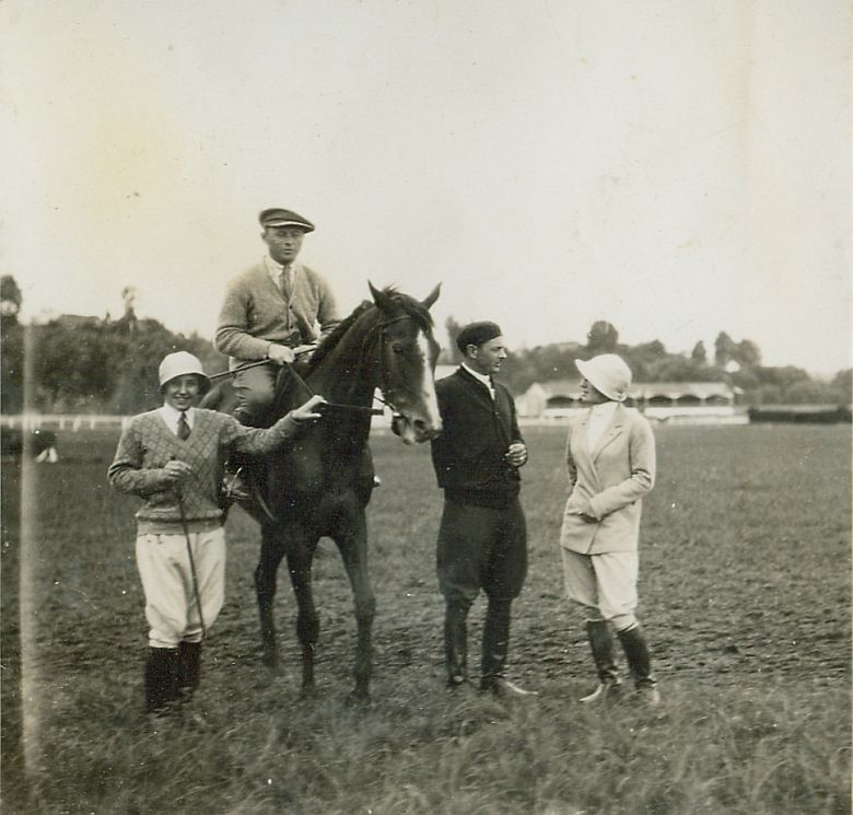 | Nr. inwentarzowy: MŁJ-XVI 1745 / 00 / 012 opis: Tor wyścigowy. Na trawie stoi klacz Dziarska, a na jej grzbiecie siedzi Jerzy Strużyński (w swetrze i kaszkiecie). Przy koniu stoją w strojach jeździeckich, od lewej: Wanda Leska, Kazimierz Ważyński, Anna Leska. W tle trybuna.data: latoczas powstania - daty graniczne: 1931-07-01 - 1931-08-31miejsce: Rury (obecnie dzielnica Lublina), tor wyścigów konnych.osoby: Wanda Leska, później Bohdanowicz (1908-1991), por. Jerzy Strużyński 14 p.u., por. Kazimierz Ważyński 3 DAK, Anna (Anka) Leska, później Leska-Daab (1910-1998).tworzywo: papier fotograficzny, błyszczącytechnika: odbitka żelatynowo-srebrowa DOP, czarno-białazespół: album rodziny Leskichwymiary (wys. x szer.): 82 x 84 [mm] Koń: 1. Dziarska, klacz
