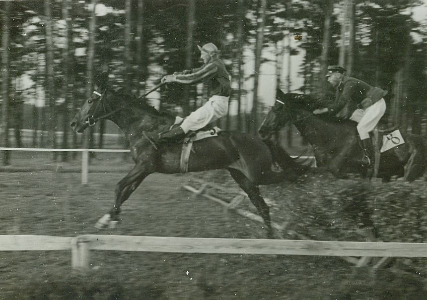 | Nr. inwentarzowy: MŁJ-XVI 1746 / 00 / 105 opis: Tor wyścigów konnych, bieg na przełaj Orpy (wieś, folwark i zaścianek w pow. wilejskim). Na ostatnim płocie: Zalotna (nr 5) pod Michałem Bohdanowiczem i Gorgias (nr 8) pod Mieczysławem Chilińskim. M. Bohdanowicz w stroju wyścigowym, P. Chiliński w mundurze i białych bryczesach. M. Bohdanowicz, w charakterystycznym dla siebie dosiadzie, prowokuje konia do błędu i "zabrania" ze sobą fragmentu przeszkody. W tle drzewa.czas powstania - daty graniczne: 1936-07-16 - 1936-07-16miejsce: Wilno, Pośpieszka.osoby: Rtm. Michał Bohdanowicz "Miś" (1903-1948), 13 p.u., dowódca 1 szwadronu "Tatarskiego". Por. Mieczysław Chiliński (1900-1939, kampania wrześniowa), 12 Pułk Artylerii Lekkiej.tworzywo: papier fotograficzny, błyszczącytechnika: odbitka żelatynowo-srebrowa DOP, czarno-białazespół: album rodziny Leskichwymiary (wys. x szer.): 84 x 116 [mm] Konie: 1. Zalotna, klacz - Shagya X - Szabla, koń, na którym w biegach na przełaj startował M. Bohdanowicz i por. Bukowski. 2. Gorgias - koń, na którym por. M. Chiliński startował w biegach na przełaj.