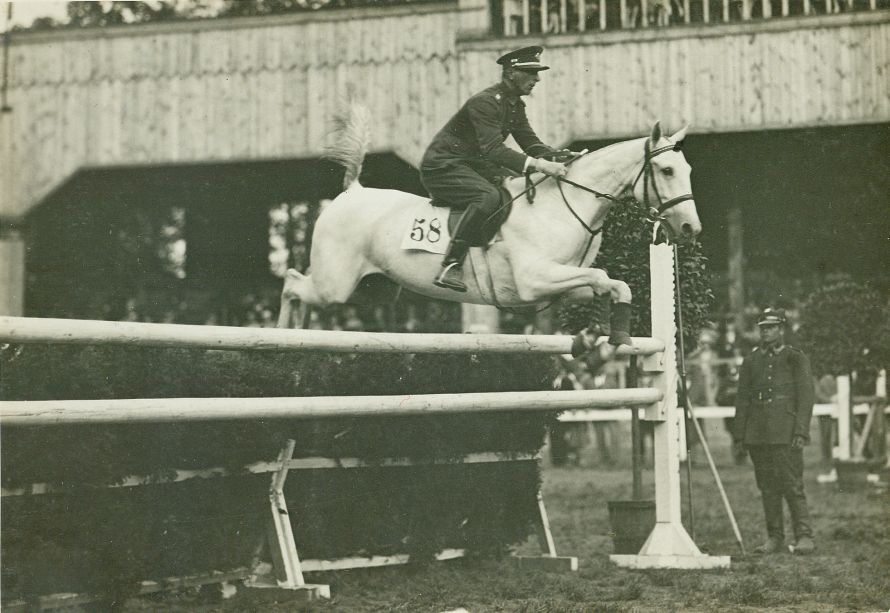 | Nr. inwentarzowy: MŁJ-XVI 1603 / 00 / 023 opis: Międzynarodowe Konkursy Hipiczne - rtm. František Ventura z Czechosłowacji w skoku na siwym koniu, być może kl. Dravna (na potniku nr 58). Przeszkoda z jedlinowego płotka i jasnych drągów, z tyłu fragment krytej trybuny.data: podano czas trwania zawodówczas powstania - daty graniczne: 1928-09-16 - 1928-09-26miejsce: Warszawa, hipodrom w Łazienkachosoby: wybitny czechosłowacki jeździec, złoty medalista z IO w Amsterdamie 1928 rtm. František Venturatworzywo: papier fotograficzny, błyszczącytechnika: odbitka żelatynowo-srebrowa DOP, czarno-białawymiary (wys. x szer.): 122 x 172 [mm] Koń: 1. Dravna, klacz - koń, na którym startował w Łazienkach František Ventura