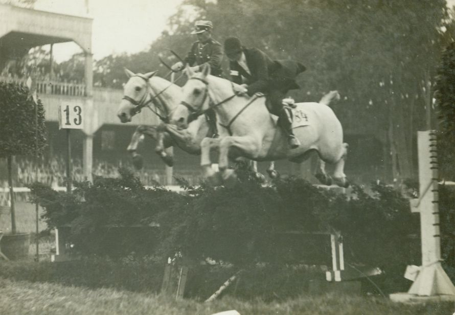 | Nr. inwentarzowy: MŁJ-XVI 1603 / 00 / 028 opis: Międzynarodowe Konkursy Hipiczne - konkurs parami o Nagrodę Łazienek. W równoległym skoku Zofia Chodkiewiczówna na siwym koniu Prosiak i por. Henryk Roycewicz na siwym koniu The Hoop. W tle fragment krytej trybuny.data: podano czas trwania zawodówczas powstania - daty graniczne: 1928-09-16 - 1928-09-26miejsce: Warszawa, hipodrom w Łazienkachosoby: por. Henryk Roycewicz (srebrny medal zespołowo w WKKW na IO w Berlinie 1936), Zofia Chodkiewiczównatworzywo: papier fotograficzny, błyszczącytechnika: odbitka żelatynowo-srebrowa DOP, czarno-białawymiary (wys. x szer.): 121 x 173 [mm] Konie: 1. Prosiak, wałach, maść siwa - koń, na którym na przełomie l. 20-30. XX w. startowała m.in. w konkursach warszawskich Zofia Chodkiewiczówna; trenowała na ujeżdżalni W.S.Woj.; charakterystyczna krępa sylwetka, stosunkowo krótka szyja i kurtyzowany ogon 2. The Hoop, klacz, maść siwa, ur. 1923 - hod. Irlandia, wł. H. Roycewicza, w 1931 r. 2. miejsce w MP w skokach (Roycewicz)