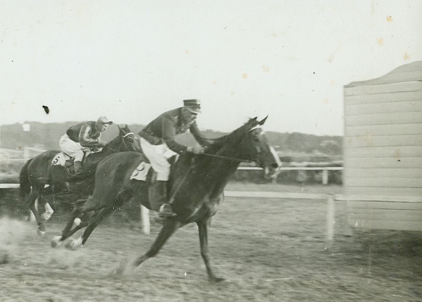 | Nr. inwentarzowy: MŁJ-XVI 1746 / 00 / 106 opis: Tor wyścigów konnych, bieg na przełaj Orpy (wieś, folwark i zaścianek w pow. wilejskim). Tuż przed celownikiem: zwycięzca Gorgias (nr 8) pod Mieczysławem Chilińskim i Zalotna (nr 5) pod Michałem Bohdanowiczem - 2. miejsce. M. Bohdanowicz w stroju wyścigowym, P. Chiliński w mundurze i białych bryczesach. Trzeci był niewidoczny na zdjęciu A. Żelewski na koniu Alibi.czas powstania - daty graniczne: 1936-07-16 - 1936-07-16miejsce: Wilno, Pośpieszka.osoby: Por. Mieczysław Chiliński (1900-1939, kampania wrześniowa), 12 Pułk Artylerii Lekkiej. Rtm. Michał Bohdanowicz "Miś" (1903-1948), 13 p.u., dowódca 1 szwadronu "Tatarskiego". Niewidoczny na zdjęciu por. Antoni Żelewski (1905-1994), 8 p.u., jeździec klasy międzynarodowej, instruktor.tworzywo: papier fotograficzny, błyszczącytechnika: odbitka żelatynowo-srebrowa DOP, czarno-białazespół: album rodziny Leskichwymiary (wys. x szer.): 85 x 117 [mm] Konie: 1. Gorgias - koń, na którym por. M. Chiliński startował w biegach na przełaj. 2. Zalotna, klacz - Shagya X - Szabla, koń, na którym w biegach na przełaj startował M. Bohdanowicz i por. Bukowski. 3. Alibi - koń, na którym w biegach na przełaj startował A. Żelewski, na zdjęciu: niewidoczny na zdjęciu