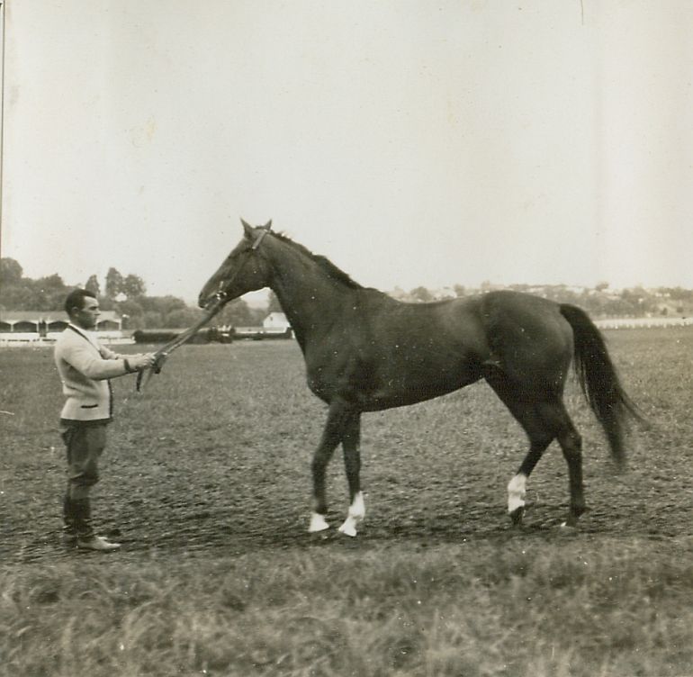 | Nr. inwentarzowy: MŁJ-XVI 1745 / 00 / 013 opis: Tor wyścigowy. Na trawie stoi klacz Esmeralda. Koń ciemnej maści, z odmianami na 4 nogach, kręci się. Za wodze trzyma mężczyzna w swetrze, bryczesach i wysokich butach. W tle m.in. trybuna.data: latoczas powstania - daty graniczne: 1931-07-01 - 1931-08-31miejsce: Rury (obecnie dzielnica Lublina), tor wyścigów konnych.tworzywo: papier fotograficzny, błyszczącytechnika: odbitka żelatynowo-srebrowa DOP, czarno-białazespół: album rodziny Leskichwymiary (wys. x szer.): 82 x 84 [mm] Koń: 1. Esmeralda, klacz - koń por. Kazimierza Ważyńskiego.