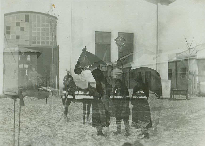 | Nr. inwentarzowy: MŁJ-XVI 1745 / 00 / 059 opis: Zdjęcie podwójnie naświetlone. Roman Pohorecki w mundurze na stojącej klaczy Elna. Kilka osób, w tle stajnia, z której żołnierz wyprowadza konia.data: marzecczas powstania - daty graniczne: 1932-03-01 - 1932-03-31miejsce: Lwów, prawdopodobnie koszary 14 Pułku Ułanówosoby: Por. Roman Pohorecki ur. 1903; 14 p.u., wybitny zawodnik ostatniego okresu przed II wojną światową.tworzywo: papier fotograficzny, błyszczącytechnika: odbitka żelatynowo-srebrowa DOP, czarno-białazespół: album rodziny Leskichwymiary (wys. x szer.): 89 x 118 [mm] Koń: 1. Elna, klacz - koń, na którym w 1932 r. jeździł Roman Pohorecki