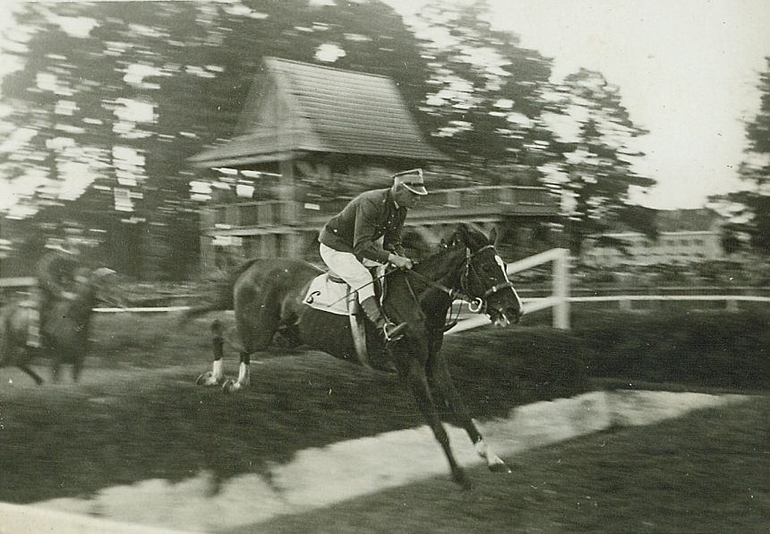 | Nr. inwentarzowy: MŁJ-XVI 1747 / 00 / 054 opis: Tor wyścigów konnych - wojskowa (jeźdźcy w mundurach) gonitwa z przeszkodami im. K.O.P. Rokitno. Wyścig nr 10, Na hyrdzie z rowem kl. Pilica pod. rtm. Michałem Bohdanowiczem. W opisie w albumie: wygrał rtm. Bohdanowicz, a "Przegląd Kawaleryjski" 10/1938 podaje, że zwyciężył rtm. Kalinowski na kl. Bagatela. Tę parę widać za rtm. Bohdanowiczem i Pilicą. W tle drewniana trybuna.czas powstania - daty graniczne: 1938-06-16 - 1938-06-16miejsce: Wilno, Pośpieszkaosoby: Rtm. Michał Bohdanowicz (1903-1948), od 1936 w 13 Pułku Ułanów Wileńskich, do 15.05.1938 dowódca 1 szwadronu "Tatarskiego"; rtm. Konstanty Kalinowski (ur. 1898), 10 p.u., po 1934 w Sztabie Naczelnego Wodza, oddział II, walczył w kampanii wrześniowej, potem w PSZ.tworzywo: papier fotograficzny, błyszczącytechnika: odbitka żelatynowo-srebrowa DOP, czarno-białazespół: album rodziny Leskichwymiary (wys. x szer.): 59 x 83 [mm] Konie: 1. Pilica, klacz - Harlekin - Brama, hod. K. Czermiński, wł. W. Wojtowicz. Koń, na którym rtm. M. Bohdanowicz startował w 1938 r. w gonitwach w Wilnie-Pośpieszce 2. Bagatela, klacz - hod. S. Kierznowski, wł. M.S.Wojsk. Koń, który w 1938 roku startował pod. rtm. Kalinowskim w wyścigach w Wilnie-Pośpieszce