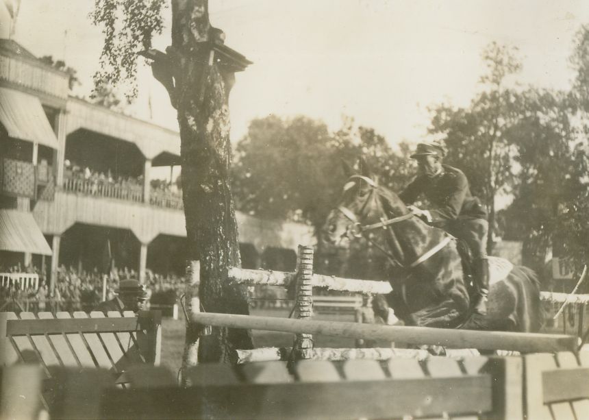 | Nr. inwentarzowy: MŁJ-XVI 1743 / 00 / 028 opis: Międzynarodowe zawody konne. Rtm. Józef Trenkwald w skoku na ciemnej maści klaczy Doneuse przez przeszkodę zasłoniętą inną przeszkodą. Koń w sportowym rzędzie (ogłowie wędzidłowe). Przy przeszkodzie pień drzewa, w tle drewniana trybuna z publicznością.czas powstania - daty graniczne: 1930-06-01 - 1930-06-11miejsce: Warszawa, Łazienki, hipodromosoby: rtm. Józef Trenkwald (1897 - 1956)tworzywo: papier fotograficzny, błyszczącytechnika: odbitka żelatynowo-srebrowa DOP, czarno-białazespół: album rodziny Leskichwymiary (wys. x szer.): 60 x 59 [mm] Koń: 1. Doneuse, klacz, rasa: xx - import z Francji, wł. K. Rómmel. Wyścigi przeszkodowe, potem skoki. Pod Rómmlem w 1928 r. brązowy medal w WKKW na IO.