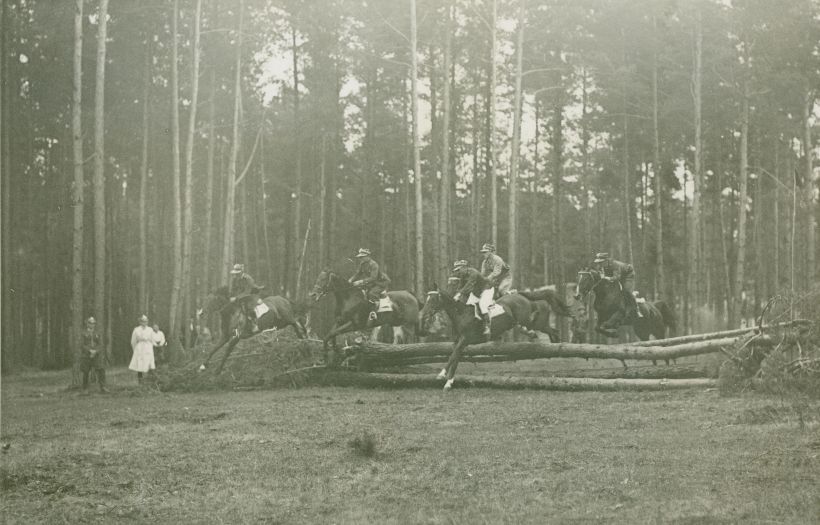 | Nr. inwentarzowy: MŁJ-XVI 1757 / 00 / 053 opis: Okolice toru wyścigów konnych, bieg na przełaj im. Obodowiec. I nagrodę zdobył por. Antoni Żelewski na koniu Naulaka. Na fotografii przeszkodę zbudowaną z wywróconych drzew pokonuje pięciu jeźdźców w mundurach na koniach ciemnej maści. Wśród nich są zwycięzcy.data: okres mitingu wyścigowego w Wilnieczas powstania - daty graniczne: 1934-06-24 - 1934-07-22miejsce: Wilno, Pośpieszkaosoby: Por. Antoni Żelewski 1905-1994 (8 p.u., jeździec klasy międzynarodowej, instruktor).tworzywo: papier fotograficzny, półbłyszczącytechnika: odbitka żelatynowo-srebrowa DOP, czarno-białazespół: album rodziny Bohdanowiczówwymiary (wys. x szer.): 147 x 221 [mm] Koń: 1. Naulaka, wałach, rasa: xx, maść kasztanowata, ur. 1926 - po Wily Attorney i Perle, hod. Marjana Jędrzejowicza, wł. i tr. S. Rozwadowski, Biegał w l. 1934-1936 w gonitwach przeszkodowych i biegach na przełaj na torach we Lwowie, Wilnie, Zakopanem. W 1934 r. startował w 5. gonitwach z przeszkodami we Lwowie i w Wilnie, wygrał dwa razy, w tym 19 lipca Steeple-chase Budsławia na dyst. 3000 m. pod A. Żelewskim. Pod tym samym jeźdźcem wygrał bieg na przełaj Budsławia. W PSB t. 3. opisany jest jako klacz., na zdjęciu: 1. miejsce