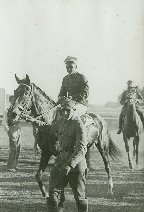 | Nr. inwentarzowy: MŁJ-XVI 1746 / 00 / 010 opis: Tor wyścigów konnych, po biegu na przełaj im. 1 Pułku Ułanów Krechowieckich. Michał Bohdanowicz (jasne bryczesy, kurtka i czapka mundurowa) na koniu Zalotna jedzie do wagi po wygraniu biegu. Za nim drugi jeździec w mundurze, dwie osoby cywilne stojące z boku.czas powstania - daty graniczne: 1936-06-28 - 1936-06-28miejsce: Wilno, Pośpieszka.osoby: Rtm. Michał Bohdanowicz "Miś" (1903-1948), 13 p.u., dowódca 1 szwadronu "Tatarskiego".tworzywo: papier fotograficzny, błyszczącytechnika: odbitka żelatynowo-srebrowa DOP, czarno-białazespół: album rodziny Leskichwymiary (wys. x szer.): 125 x 86 [mm] Koń: 1. Zalotna, klacz - Shagya X - Szabla, koń, na którym w biegach na przełaj startował M. Bohdanowicz i por. Bukowski.