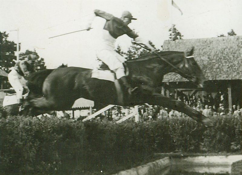 | Nr. inwentarzowy: MŁJ-XVI 1757 / 00 / 030 opis: Tor wyścigów konnych. Jedna z czterech gonitw przeszkodowych, w których por. Czesław Szadkowski startował w Wilnie na klaczy Insolente. Skok trybunowy (rów za żywopłotem). W tle inny jeździec i publiczność. Por. Szadkowski prawdopodobnie w barwach stajni 10 p.u. (k. i r. górna połowa amarantowa, dolna biała, na kurtce poprzeczny pas granatowy, cz. amarantowa).data: jeden z dni: 24 czerwca, 1, 8, 19 lipca 1934czas powstania - daty graniczne: 1934-06-24 - 1934-07-19miejsce: Wilno, Pośpieszkaosoby: Por. Czesław Szadkowski 1903-1973 (10 p.u., trener i jeździec sportowy i wyścigowy, w 1939 dowódca 2 szwadronu, późniejszy „Muszkieter” (w ramach wielkiej polityki skazany w 1942 na karę śmierci przez sąd wojskowy).tworzywo: papier fotograficzny, błyszczącytechnika: odbitka żelatynowo-srebrowa DOP, czarno-białazespół: album rodziny Bohdanowiczówwymiary (wys. x szer.): 57 x 78 [mm] Koń: 1. Insolente, klacz, rasa: xx, maść gniada, ur. 1928 - po Blue Danube i Reduta, hod. K. hr. Zamoyskiego, wł. Grona Oficerów 10 p.u., w l. 1934-35 startował na niej w Wilnie w wyścigach przeszkodowych por. Szadkowski, który także klacz trenował