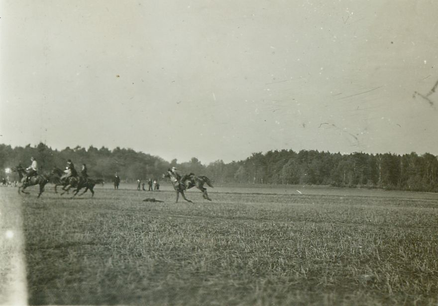 | Nr. inwentarzowy: MŁJ-XVI 1743 / 00 / 070 opis: Na rozległej łące lub ściernisku galopuje na koniach kilkoro jeźdźców. Ostatni (Wilhelm Lewicki na klaczy Lulu) galopie zsiada z konia, by złapać "lisa" - makietę. W tle las, grupka dzieci i mężczyzna w płaszczu.czas powstania - daty graniczne: 1930-10-01 - 1930-10-31miejsce: Majątek Słaboszewiczów - Ostrowiec koło Wołominaosoby: rtm. Wilhelm [Wil] Rogala-Lewicki (1898-1992)tworzywo: papier fotograficzny, błyszczącytechnika: odbitka żelatynowo-srebrowa DOP, czarno-białazespół: album rodziny Leskichwymiary (wys. x szer.): 59 x 81 [mm] Koń: 1. Lulu, klacz