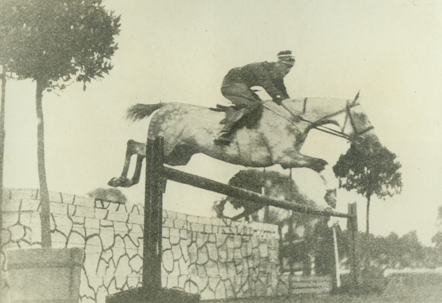 | Nr. inwentarzowy: MŁJ-XVI 1639 / 00 / 012 opis: Plac konkursowy, por. Michał Gutowski skacze przez bankiet ze stacjonatą na siwej kl. Hanum - zeskokok. Bankiet w formie muru, ozdobiony drzewkami w donicach.czas powstania - daty graniczne: 1930-01-01 - 1939-08-31miejsce: jeden z europejskich hipodromówosoby: por. Michał Gutowski 17 p.u.tworzywo: papier fotograficzny, matowytechnika: odbitka żelatynowo-srebrowa z wydrukuzespół: album Clemensa Nagla Międzynarodowi artyści w jeździe przez przeszkodywymiary (wys. x szer.): 121 x 171 [mm] Koń: 1. Hanum, klacz, maść siwa - 148 cm w kłębie; prywtny koń M. Gutowskiego - kupiona od Chłapowskich w 1930 r., koń klasy międzynarodowej