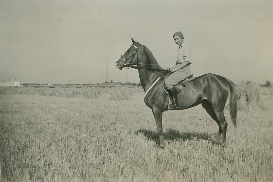 | Nr. inwentarzowy: MŁJ-XVI 1629 / 00 / 040 opis: Rżysko, amazonka na kasztanowatej, szlachetnej klaczy; kobieta w berecie, długich butach, bryczesach i jasnej bluzce. Koń w ogłowiu z polskim nachrapnikiem i sportowym siodle z napierśnikiem. W oddali zabudowania.data: żniwa 1938 lub 1939czas powstania - daty graniczne: 1938-06-01 - 1939-08-31miejsce: okolice Hrubieszowa(?)tworzywo: papier fotograficzny, błyszczący, Kodak Veloxtechnika: odbitka żelatynowo-srebrowa DOP, czarno-białazespół: album rodziny Grotthuswymiary (wys. x szer.): 60 x 86 [mm]