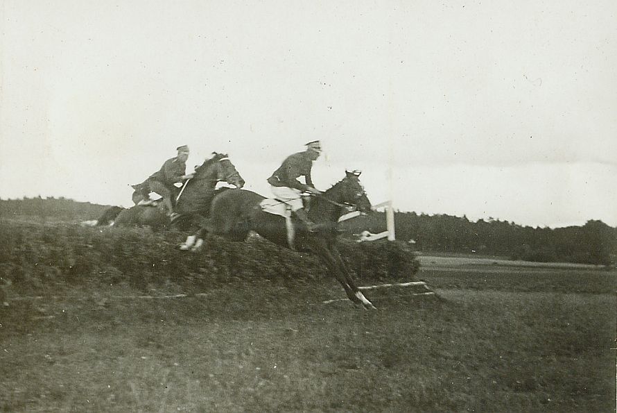 | Nr. inwentarzowy: MŁJ-XVI 1747 / 00 / 052 opis: Tor wyścigów konnych - wojskowa (jeźdźcy w mundurach) gonitwa z przeszkodami im. K.O.P. Rokitno. Wyścig nr 10, Na przeszkodzie, od prawej: kl. Pilica pod. rtm. Michałem Bohdanowiczem i kl. Bagatela pod. rtm. Konstantym Kalinowskim. Opisy w albumie podają, że gonitwę wygrał rtm. Bohdanowicz, a "Przegląd Kawaleryjski" 10/1938 podaje, że zwyciężył rtm. Kalinowski.czas powstania - daty graniczne: 1938-06-16 - 1938-06-16miejsce: Wilno, Pośpieszkaosoby: Rtm. Michał Bohdanowicz (1903-1948), od 1936 w 13 Pułku Ułanów Wileńskich, do 15.05.1938 dowódca 1 szwadronu "Tatarskiego"; rtm. Konstanty Kalinowski (ur. 1898), 10 p.u., po 1934 w Sztabie Naczelnego Wodza, oddział II, walczył w kampanii wrześniowej, potem w PSZ.tworzywo: papier fotograficzny, błyszczącytechnika: odbitka żelatynowo-srebrowa DOP, czarno-białazespół: album rodziny Leskichwymiary (wys. x szer.): 58 x 83 [mm] Konie: 1. Pilica, klacz - Harlekin - Brama, hod. K. Czermiński, wł. W. Wojtowicz. Koń, na którym rtm. M. Bohdanowicz startował w 1938 r. w gonitwach w Wilnie-Pośpieszce 2. Bagatela, klacz - hod. S. Kierznowski, wł. M.S.Wojsk. Koń, który w 1938 roku startował pod. rtm. Kalinowskim w wyścigach w Wilnie-Pośpieszce