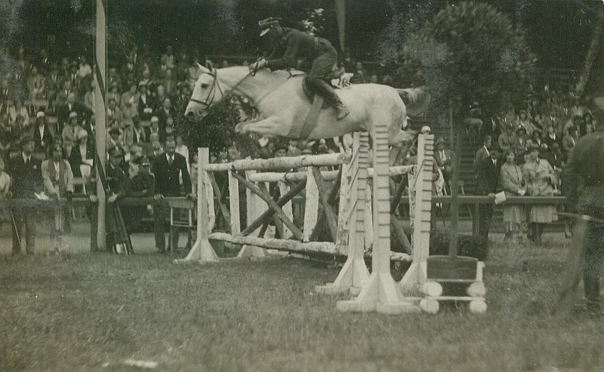 | Nr. inwentarzowy: MŁJ-XVI 1744 / 00 / 072 opis: Międzynarodowe i Krajowe Konkursy Hipiczne w Łazienkach. Por. Henryk Roycewicz w skoku przez okser na siwym koniu The Hoop. Obok przeszkody żołnierz (widać część sylwetki). Na potniku numer. Przy szrankach i na trybunach liczni kibice. W tle drzewa.czas powstania - daty graniczne: 1931-05-28 - 1931-06-08miejsce: Warszawa, hipodrom w Łazienkachosoby: por. Henryk Leliwa-Roycewicz (1898-1990) 25 p.uł., olimpijczyk z Berlina 1936 (WKKW - srebrny medal drużynowo)tworzywo: papier fotograficzny, półbłyszczącytechnika: odbitka żelatynowo-srebrowa DOP, czarno-białazespół: album rodziny Leskichwymiary (wys. x szer.): 83 x 132 [mm] Koń: 1. The Hoop, klacz, maść siwa, ur. 1923 - hod. Irlandia, wł. H. Roycewicza, w 1931 r. 2. miejsce w MP w skokach (Roycewicz), na zdjęciu: 9 lat