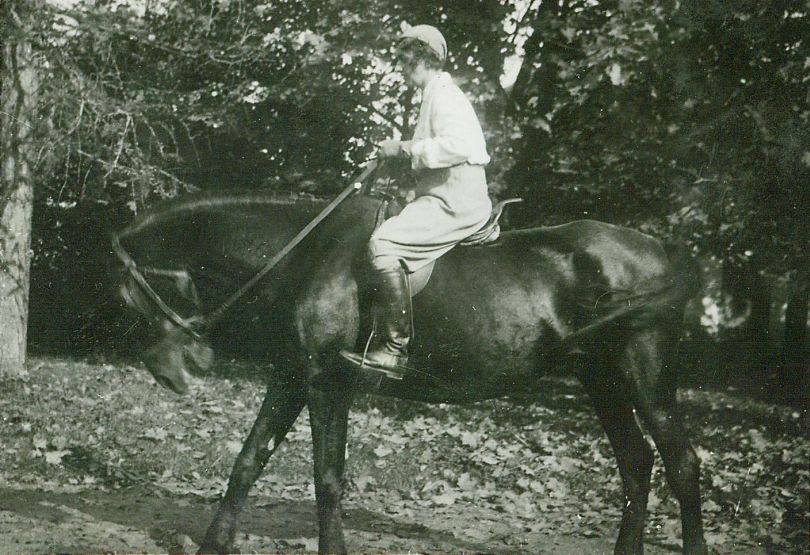 | Nr. inwentarzowy: MŁJ-XVI 1757 / 00 / 078 opis: Pod drzewami, w jesiennej scenerii do zdjęcia pozuje na koniu Maria Bohdanowiczówna. Koń ciemnej maści, w siodle przypominającym polskie lub rosyjskie oficerskie, ale z krótszymi ławkami. Kobieta w jasnym stroju do jazdy konnej. Widać brak wprawy - koń broni się przed za wysoko uniesioną ręką, łydka ucieka do przodu.data: październik 1934 r.czas powstania - daty graniczne: 1934-10-01 - 1934-10-31miejsce: Stajki - majątek Bohdanowiczów, obecnie wieś na Białorusi w rejonie wilejskim, obwodu mińskiegoosoby: W albumie "Maryńcia" - to imię pojawia się często w rodzinie Bohdanowiczów, może: Maria Bohdanowiczówna 1900–1942 (ostatnia właścicielka majątku Maćkowce; rozstrzelana niedaleko swego domu przez Gestapo za współpracę z polskim podziemiem).tworzywo: papier fotograficzny, błyszczącytechnika: odbitka żelatynowo-srebrowa DOP, czarno-białazespół: album rodziny Bohdanowiczówwymiary (wys. x szer.): 57 x 82 [mm]