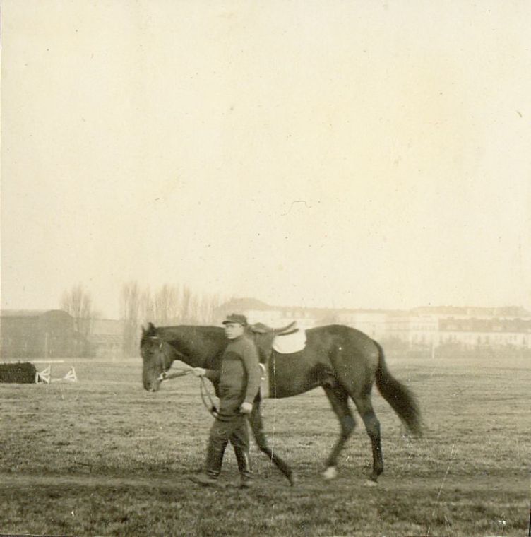| Nr. inwentarzowy: MŁJ-XVI 1753 / 00 / 120 opis: Prezentacja koni ze stajni wyścigowej 9 p.s.k. - og. Herold. Chłopiec lub młody mężczyzna prowadzi w ręku osiodłanego konia po trawiastym podłożu. W tle topole i zabudowania wokół toru.data: kwiecień 1930 r.czas powstania - daty graniczne: 1930-04-01 - 1930-04-30miejsce: Warszawa, Pole Mokotowskie, tor wyścigów konnychinne nazwy własne: 9 Pułk Strzelców Konnych imienia generała Kazimierza Pułaskiego tworzywo: papier fotograficzny, błyszczącytechnika: odbitka żelatynowo-srebrowa DOP, czarno-białazespół: album rodziny Bohdanowiczówwymiary (wys. x szer.): 50 x 50 [mm] Koń: 1. Herold, ogier, rasa: xx, maść gniada, ur. 1925 - Mości Książę i Helenka, hod. Fr. Wężyka, wł. Gr. of. 9 p.s.k., od 1932 Bohdanowicz, na przeł. l. 20/30 XX w. startował w gon. płaskich, płotowych i przeszkodowych, na torach w Wilnie, Grajewie, Warszawie, Bydgoszczy, Ciechocinku, Kielcach, Łodzi, Łucku, Poznaniu, Katowicach, pod Bohdanowiczem, Rómmlem, Bylczyńskim, chłopcami: Koreckim i Głowackim, dżokejami: Czernuszenko, Sakowiczem, Kucharskim, Szyszkowskim, Amosse, Ziemiańskim, jeźdźcami: Cherubimem i Lipińskim; tr.: Pacurko, Bylczyński, Bohdanowicz