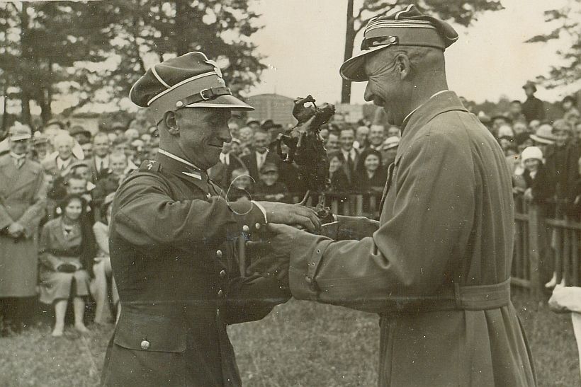 | Nr. inwentarzowy: MŁJ-XVI 1758 / 00 / 032 opis: Tor wyścigów konnych. Rtm. Michał Bohdanowicz odbiera nagrodę za zwycięstwo na koniu Bakarat w Steeple-chase im. Ministra Rolnictwa i Reform Rolnych. Nagrodę - rzeźbę - wręcza płk Czesław Kozierowski. W tle liczni kibice.czas powstania - daty graniczne: 1935-07-07 - 1935-07-07miejsce: Wilno, Pośpieszkaosoby: Rtm. Michał Bohdanowicz 1903-48 (syn Jana Bohdanowicza i Marii z Cywińskich. W latach 1932-36 i przed II wojną w 4 p.u., nazywany "Misiem", w 1935 r. wygrał 12 gonitw podczas mitingu wyścigowego w Wilnie); płk.Czesław Kozierowski 1890-1940 Charków (do 1932 dow. 4 p.u., potem O.T.O., lubiany, popierał sport i wyścigi, bardzo aktywny jako wiceprezes Wileńskiego Towarzystwa Hodowli Koni i Popierania Sportu Konnnego).inne nazwy własne: O.T.O. - Oficerski Trybunał Orzekającytworzywo: papier fotograficzny, błyszczącytechnika: odbitka żelatynowo-srebrowa DOP, czarno-białazespół: album rodziny Bohdanowiczówwymiary (wys. x szer.): 85 x 125 [mm] Koń: 1. Bakarat, ogier, rasa: xx, maść kasztanowata, ur. 1925 - (od 1934 wałach), Harsona – Balata, hod. Romana Czaykowskiego, wł. K. Dzierzbickiego, później Z. Cierpickiego. Startował w l. 1927-1937 w gonitwach płaskich, płotowych i przeszkodowych (prawie 100x, 1/3 zwycięstw) na torach w Baranowiczach, Łodzi, Wilnie, Bydgoszczy, Poznaniu, Kielcach, Radomiu, Lublinie, Warszawie. Dosiadali go: M. Bohdanowicz, por. Kwieciński, j. Ustinow, j. Gajewski, dż. Kucharski; trenerzy: S. Kowalski, Z. Cierpicki, S. Balcer, M. Bohdanowicz., na zdjęciu: nie ma go na zdjęciu, 1. miejsce