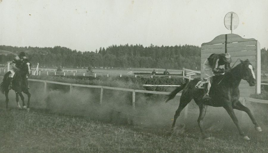 | Nr. inwentarzowy: MŁJ-XVI 1746 / 00 / 018 opis: Tor wyścigów konnych, Steeple-chase im. Pana Ministra Władysława Raczkiewicza. Przez celownik przejeżdża Michał Bohdanowicz (jasne bryczesy, ciemna kurtka z jasnymi pasami na rękawach) na koniu Bakarat (2. m.). Trzy długości za nim galopuje zdobywca 3. m. por. Jan Goszczyński na kl. Gazella II. Wygrał niewidoczny na zdjęciu rtm. Władysław Bobiński na kl. Cherie.czas powstania - daty graniczne: 1936-06-28 - 1936-06-28miejsce: Wilno, Pośpieszka.osoby: Rtm. Michał Bohdanowicz "Miś" (1903-1948), 13 p.u., dowódca 1 szwadronu "Tatarskiego". Por. Jan Goszczyński (1896-?), 5 DAK, właściciel stajni wyścigowej. Poza kadrem rtm. Władysław Bobiński (1901-1975 Londyn), 15 p.u., uczestnik biegów na przełaj, steeple-chase.tworzywo: papier fotograficzny, błyszczącytechnika: odbitka żelatynowo-srebrowa DOP, czarno-białazespół: album rodziny Leskichwymiary (wys. x szer.): 73 x 125 [mm] Konie: 1. Bakarat, ogier, rasa: xx, maść kasztanowata, ur. 1925 - (od 1934 wałach), Harsona – Balata, hod. Romana Czaykowskiego, wł. K. Dzierzbickiego, później Z. Cierpickiego. Startował w l. 1927-1937 w gonitwach płaskich, płotowych i przeszkodowych (prawie 100x, 1/3 zwycięstw) na torach w Baranowiczach, Łodzi, Wilnie, Bydgoszczy, Poznaniu, Kielcach, Radomiu, Lublinie, Warszawie. Dosiadali go: M. Bohdanowicz, por. Kwieciński, j. Ustinow, j. Gajewski, dż. Kucharski; trenerzy: S. Kowalski, Z. Cierpicki, S. Balcer, M. Bohdanowicz. 2. Gazella II, klacz, rasa: xx, maść gniada, ur. 1928 - po Manton i Gumdrop, hod. J. Daszkiewicza, wł. J. Łaszkiewicza, następnie por. A. Gucewicza, w 1934 r. grona oficerów 13 D.A.K., koń trenowany przez J. Goszczyńskiego, który także dosiadał klaczy w gonitwach przeszkodowych, w steeplach startował też na niej J. Żwan 3. Cherie, klacz - koń, na którym Wł. Bobiński startował w steeple-chase., na zdjęciu: niewidoczna na zdjęciu
