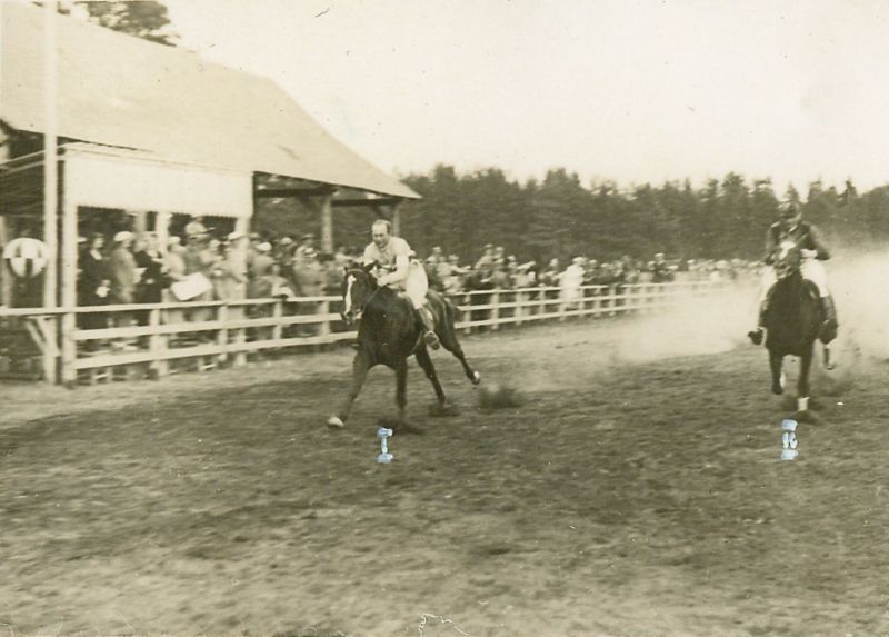 | Nr. inwentarzowy: MŁJ-XVI 1757 / 00 / 041 opis: Tor wyścigów konnych, gonitwa z przeszkodami - steeple-chase im. Hetmana Stanisława Żółkiewskiego na dyst. 3600 m. Prawdopodobnie finisz - przed trybuną z publicznością galopują por. Włodzimierz Korytkowski na koniu Ortel (1. m.) i por. Jan Goszczyński na koniu Poznaniak (2. m.). Miejsca zaznaczone na fotografii. Jeźdźcy w strojach wyścigowych - Korytkowski w barwach 14 p.u.(bez czapki), Goszczyński w barwach własnych.czas powstania - daty graniczne: 1934-07-05 - 1934-07-05miejsce: Wilno, Pośpieszkaosoby: Por. Włodzimierz Korytkowski ur. 1901 (14 p.u., wszechstronny jeździec wyścigowy - właściciel stajni wyścigowej i sportowy klasy międzynarodowej); por. Jan Goszczyński ur. 1896 (5 DAK, właściciel stajni wyścigowej, trener i jeździec wyścigowy).tworzywo: papier fotograficzny, błyszczącytechnika: odbitka żelatynowo-srebrowa DOP, czarno-białazespół: album rodziny Bohdanowiczówwymiary (wys. x szer.): 56 x 79 [mm] Konie: 1. Ortel, wałach, rasa: xx, maść kara, ur. 1929 - po Melk i Kinga, hod. Ludwika Orpiszewskiego, wałach od 1935 r., wł. grona oficerów 1, później 14 p.u., w l. 1932-1935 startował na torach w Łodzi, Warszawie, Zakopanem, Lwowie i Wilnie w gonitwach płaskich, płotowych i przeszkodowych. W WW opisywany jako skarogniady lub ciemnogniady. W 1934 r. m.in. wygrał pod Wł. Korytkowskim (także trener) steeple-chase Orpy i im. Hetmana Stanisława Żółkiewskiego., na zdjęciu: 1. miejsce 2. Poznaniak, ogier, rasa: xx, maść kasztanowata, ur. 1929 - po Fils du Vent i Branka, hod. M. Róga, wł. por. J. Goszczyńskiego (trener i jeździec). W 1934 r. biegał we Lwowie (płoty) i Wilnie (przeszkody), na 8 startów 5 razy wygrał, 3 razy był drugi; w 1935 r. biegał w Wilnie., na zdjęciu: 2. miejsce