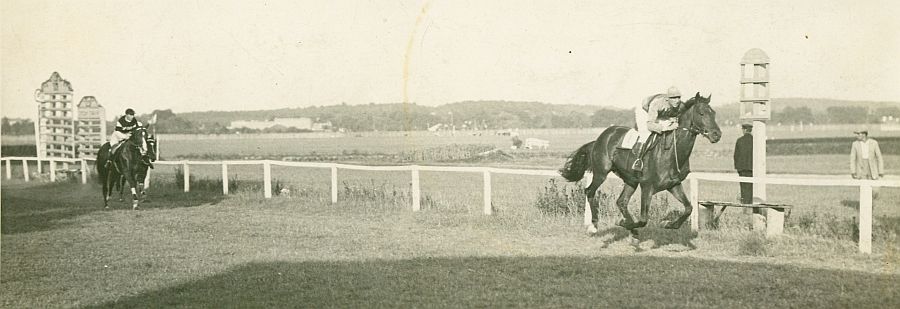 | Nr. inwentarzowy: MŁJ-XVI 1751 / 00 / 012 opis: Tor wyścigów konnych. Nagroda 10.000 zł, gonitwa z płotami, dystans około 4000 m. Herold pod jeźdźcem Stefanem Cherubimem (barwy stajni 9 p.s.k.: k. i r. żółte z ciemnozielonym pasem, cz. żółta) bije Flibustiera pod jeźdźcem Antonim Gajewskim (barwy stajni K. Rómmla: k. i r. białe, w poprzeczne czarne pasy, cz. czerwona). Wygrał łatwo, o 10 długości.