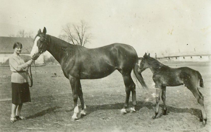 | Nr. inwentarzowy: MŁJ-XVI 1753 / 00 / 135 opis: Janina Kotlińska prezentuje klacz Gazlan ze źrebięciem - ogierkiem Fez. W tle zabudowania gospodarcze.data: kwiecień 1930 r.czas powstania - daty graniczne: 1930-04-01 - 1930-04-30miejsce: Parzniewice (łódzkie, majątek Kotlińskich, od 1931 r. Wereszczyńskich)osoby: Janina Kotlińska 1907-1989 („Nina”, "Ninon").tworzywo: papier fotograficzny, półmatowytechnika: odbitka żelatynowo-srebrowa DOP, czarno-białazespół: album rodziny Bohdanowiczówwymiary (wys. x szer.): 53 x 83 [mm] Konie: 1. Gazlan, klacz, maść kasztanowata - klacz hodowlana Kazimierza Kotlińskiego, duże odmiany na głowie i nogach, matka ur. w 1930 r. ogierka Fez 2. Fez, ogier, ur. 1930 - koń hod. Kazimierza Kotlińskiego, syn kl. Gazlan