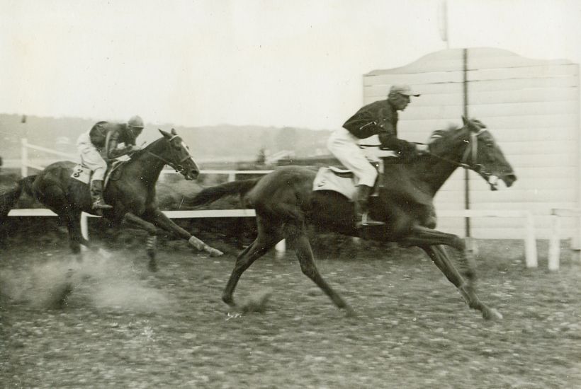 | Nr. inwentarzowy: MŁJ-XVI 1758 / 00 / 095 opis: Tor wyścigów konnych, steeple-chase Małopolskiego Towarzystwa Zachęty do Hodowli Koni (3600 m). Finisz gonitwy, na celowniku: koń Gwido pod rtm. Ludwikiem Jędrzejewski (1. miejsce), koń Ortel pod rtm. Michałem Bohdanowiczem (2. miejsce). Jeźdźcy w strojach wyścigowych. Konie w ochraniaczach na przednich nogach, Gwido z numerem 5 na potniku, Ortel z numerem 3 na potniku.czas powstania - daty graniczne: 1935-07-18 - 1935-07-18miejsce: Wilno, Pośpieszkaosoby: Rtm. Ludwik Jędrzejewski 1898-1960 (4 p.u., D.O.K. IV, właściciel stajni wyścigowej, w l. 30. XX w. startował w skokach i WKKW oraz wyścigach dżentelmeńskich); Rtm. Michał Bohdanowicz 1903-1948 (syn Jana Bohdanowicza i Marii z Cywińskich. W latach 1932-1936 i przed II wojną w 4 Pułku Ułanów Zaniemeńskich, od 1936 w 13 Pułku Ułanów Wileńskich; nazywany "Misiem"; miłośnik wyścigów płotowych, przeszkodowych i biegów na przełaj).tworzywo: papier fotograficzny, błyszczącytechnika: odbitka żelatynowo-srebrowa DOP, czarno-białazespół: album rodziny Bohdanowiczówwymiary (wys. x szer.): 85 x 123 [mm] Konie: 1. Gwido, wałach, rasa: półkrwi, maść kasztanowata - hod. Stadnin Państwowych, wł. L. Jędrzejewskiego, pod którym startował w gonitwach przeszkodowych, na zdjęciu: 1. miejsce 2. Ortel, wałach, rasa: xx, maść kara, ur. 1929 - po Melk i Kinga, hod. Ludwika Orpiszewskiego, wałach od 1935 r., wł. grona oficerów 1, później 14 p.u., w l. 1932-1935 startował na torach w Łodzi, Warszawie, Zakopanem, Lwowie i Wilnie w gonitwach płaskich, płotowych i przeszkodowych. W WW opisywany jako skarogniady lub ciemnogniady. W 1934 r. m.in. wygrał pod Wł. Korytkowskim (także trener) steeple-chase Orpy i im. Hetmana Stanisława Żółkiewskiego., na zdjęciu: 2. miejsce