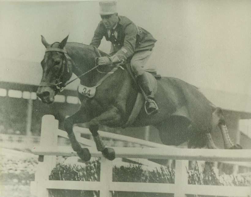 | Nr. inwentarzowy: MŁJ-XVI 1639 / 00 / 032 opis: Francuz (na głowie kepi) por. de Roches de Chassays na koniu ciemnej maści Olivette skacze przez przeszkodę z jasnych drągów i gałęzi. Koń w sportowym rzędzie, ogłowie wędzidłowe, na napierśniku nr 64. W tle trybuny.czas powstania - daty graniczne: 1929-01-01 - 1939-08-31miejsce: jeden z europejskich hipodromówosoby: Francuz por. de Roches de Chassaystworzywo: papier fotograficzny, matowytechnika: odbitka żelatynowo-srebrowa z innej odbitkizespół: album Clemensa Nagla Międzynarodowi artyści w jeździe przez przeszkodywymiary (wys. x szer.): 124 x 153 [mm] Koń: 1. Olivette