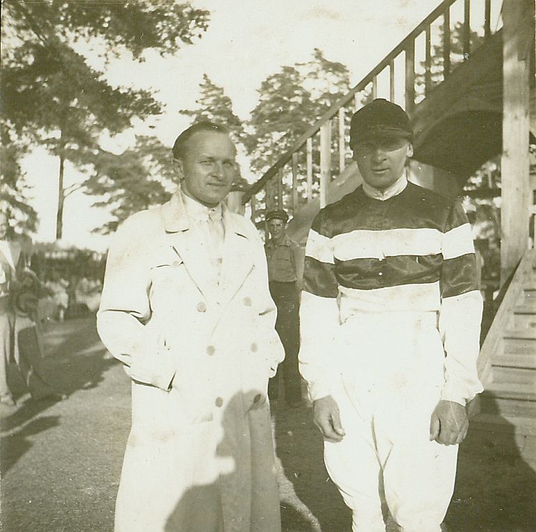 | Nr. inwentarzowy: MŁJ-XVI 1746 / 00 / 129 opis: Tor wyścigów konnych. Przed schodami trybuny stoją: dr Zajączkowski (w prochowcu) i Karol Rómmel (w stroju wyścigowym - białe bryczesy, jasna kurtka z poprzecznymi ciemnymi pasami, ciemna czapka).data: lato 1936 r.czas powstania - daty graniczne: 1936-06-01 - 1936-09-30miejsce: Wilno, Pośpieszka.osoby: Dr Zajączkowski - uczestnik wyścigów konnych. Ppłk Karol Rómmel, wybitny jeździec, olimpijczyk, od 1929 r. w stanie spoczynku.tworzywo: papier fotograficzny, półbłyszczącytechnika: odbitka żelatynowo-srebrowa DOP, czarno-białazespół: album rodziny Leskichwymiary (wys. x szer.): 59 x 58 [mm]