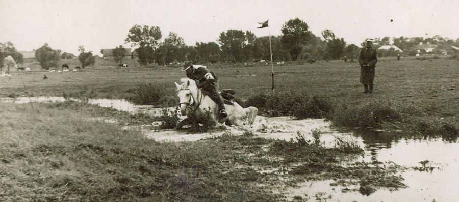 | Nr. inwentarzowy: MŁJ-XVI 1757 / 00 / 056 opis: Konne Mistrzostwa Wojska Polskiego "Militari". Próba terenowa (kros, cross). Grząską rzeczkę pokonuje por. Janusz Poziomski na siwym koniu. Widać jasną opaskę na ramieniu zawodnika i plastron. Za wodą stoi oficer, w głębi wiejski krajobraz.czas powstania - daty graniczne: 1934-07-26 - 1934-07-29miejsce: Hrubieszówosoby: Por. Janusz Poziomski 1906-1944 Powstanie Warszawskie (w 1934 r. 3 p.s.k., uczestnik konkursów w ujeżdżeniu, skokach i pokazów konia wierzchowego).tworzywo: papier fotograficzny, półbłyszczącytechnika: odbitka żelatynowo-srebrowa DOP, czarno-białazespół: album rodziny Bohdanowiczówwymiary (wys. x szer.): 60 x 129 [mm]