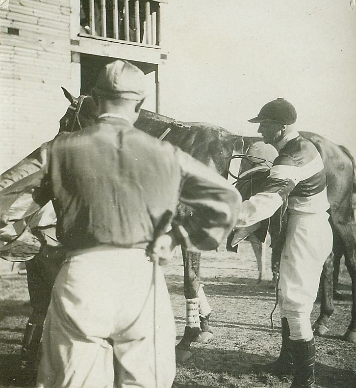 | Nr. inwentarzowy: MŁJ-XVI 1746 / 00 / 131 opis: Tor wyścigów konnych. Obok trybuny stoi tyłem Michał Bohdanowicz (w stroju wyścigowym - białe bryczesy, ciemna kurtka, pasy na rękawach i czapka w podobnym kolorze, w ręce palcat) oraz ppłk Karol Rómmel (w stroju wyścigowym - białe bryczesy, jasna kurtka z poprzecznymi ciemnymi pasami, ciemna czapka) - rozsiodłuje konia.data: lato 1936 r.czas powstania - daty graniczne: 1936-06-01 - 1936-09-30miejsce: Wilno, Pośpieszka.osoby: Rtm. Michał Bohdanowicz "Miś" (1903-1948), 13 p.u., dowódca 1 szwadronu "Tatarskiego". Ppłk Karol Rómmel, wybitny jeździec, olimpijczyk, od 1929 r. w stanie spoczynku.tworzywo: papier fotograficzny, półbłyszczącytechnika: odbitka żelatynowo-srebrowa DOP, czarno-białazespół: album rodziny Leskichwymiary (wys. x szer.): 59 x 54 [mm]
