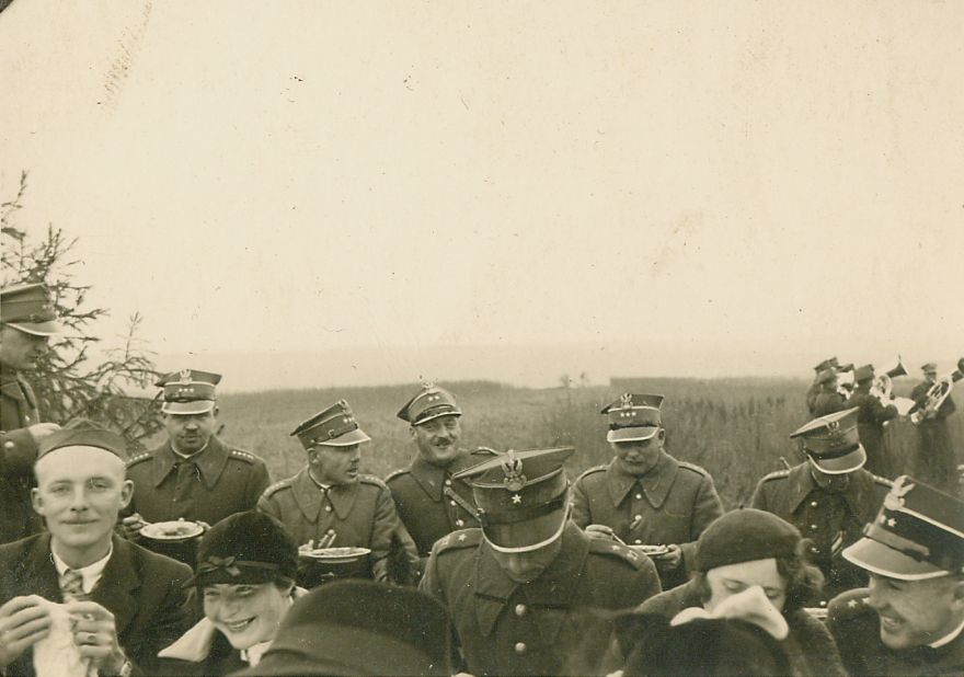 | Nr. inwentarzowy: MŁJ-XVI 1629 / 00 / 006 opis: Uczestnicy biegu jedzą bigos na świeżym powietrzu. Ok. 12 osób, głównie oficerowie, 2 kobiety i cywil - hr. Andrzej Potocki (pierwszy z lewej). Z tyłu po prawej przygrywa na instrumentach dętych wojskowa orkiestra - widać kilku muzyków.czas powstania - daty graniczne: 1938-01-01 - 1938-12-31miejsce: okolice Hrubieszowaosoby: hr. Andrzej Potockitworzywo: papier fotograficzny, półbłyszczącytechnika: odbitka żelatynowo-srebrowa DOP, czarno-białazespół: album rodziny Grotthuswymiary (wys. x szer.): 63 x 86 [mm]