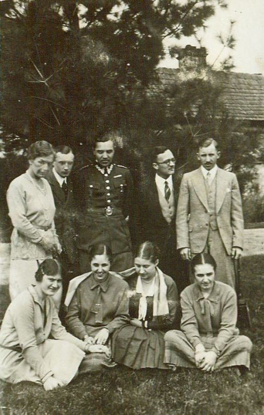 | Nr. inwentarzowy: MŁJ-XVI 1753 / 00 / 139 opis: Upozowane do zdjęcia w majątku Parzniewice towarzystwo. Stoją od lewej: Maria Leska, Maniek(?), rtm. Wilhelm Lewicki, p. Zbyszek, Jerzy Pietraszewski. Siedzą od lewej: Janina Kotlińska, Wanda Leska, Zofia Pietraszewska, Anna Leska.data: kwiecień 1930 r.czas powstania - daty graniczne: 1930-04-01 - 1930-04-30miejsce: Parzniewice (łódzkie, majątek Kotlińskich, od 1931 r. Wereszczyńskich)osoby: Maria Leska 1886-1949; Maniek(?); rtm. Wilhelm Rogala-Lewicki 1898-1992; p. Zbyszek; Jerzy Pietraszewski 1903-1974 lub 1982; Janina Kotlińska 1907-1989; Wanda Leska 1908-1991; Zofia Pietraszewska 1910-1983 Anna Leska 1910-1998.tworzywo: papier fotograficzny, półbłyszczącytechnika: odbitka żelatynowo-srebrowa DOP, czarno-białazespół: album rodziny Bohdanowiczówwymiary (wys. x szer.): 81 x 53 [mm]