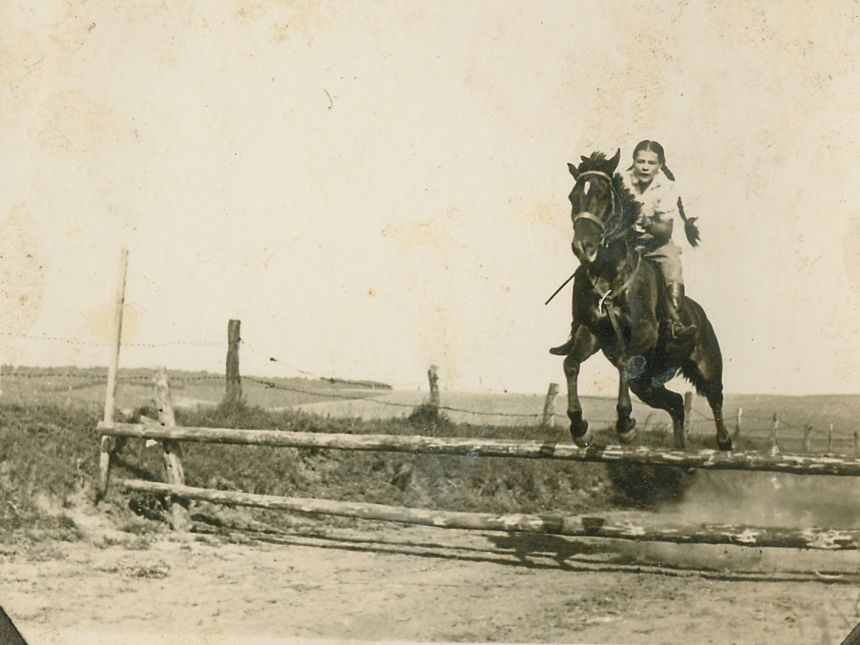 opis: Barbara Grotthus w skoku przez przeszkodę. Młoda kobieta z warkoczami, w nieoficjalnym stroju jeździeckim pokonuje na koniu ciemnej maści prostą przeszkodę ustawioną na drodze.