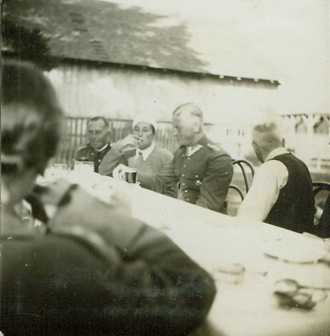 | Nr. inwentarzowy: MŁJ-XVI 1746 / 00 / 127 opis: Tor wyścigów konnych. Śniadanie "po robocie". Przy nakrytym jasnym obrusem stole siedzi pięć osób, od lewej: kobieta (tyłem), mężczyzna w mundurze, Wanda Bohdanowicz (jasny beret, sweter, pali papierosa), Michał Bohdanowicz (w mundurze), mężczyzna (jasna koszula, ciemna kamizelka). W tle ogrodzenie, budynek - stodoła?data: lato 1936 r.czas powstania - daty graniczne: 1936-06-01 - 1936-09-30miejsce: Wilno, Pośpieszka.osoby: Wanda Bohdanowicz zd. Leska (1908-1991), córka Juliusza Leskiego i Marii zd. Olszyńskiej, żona Michała Bohdanowicza. Rtm. Michał Bohdanowicz "Miś" (1903-1948), 13 p.u., dowódca 1 szwadronu "Tatarskiego".tworzywo: papier fotograficzny, półbłyszczącytechnika: odbitka żelatynowo-srebrowa DOP, czarno-białazespół: album rodziny Leskichwymiary (wys. x szer.): 58 x 58 [mm]