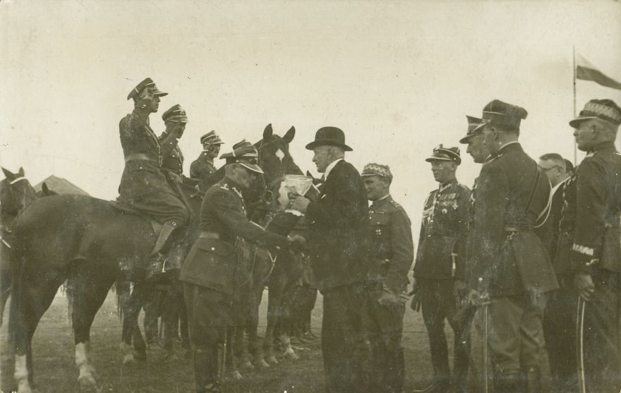 | Nr. inwentarzowy: MŁJ-XVI 1641 / 00 / 021 opis: Zawody organizowane przez Komitet Targów Końskich w Gnieźnie, wręczanie nagród. Plac konkursowy - na stojących koniach siedzą i salutują oficerowie - widać trzech. Przed nimi 6 oficerów i 2 cywili. Elegancko, na ciemno ubrany cywil w meloniku wręcza puchar i podaje rękę oficerowi - dowódcy?, szefowi ekipy? Z prawej polska flaga.data: podano daty pierwszego dnia zawodów w 1930 i ostatniego w 1939 r., prawdopodobnie 28.04.-03.05. 1934 r.czas powstania - daty graniczne: 1930-04-25 - 1939-05-03miejsce: Gniezno, hipodrom Komitetu Targów Końskich w Gnieźnietworzywo: papier fotograficzny, półbłyszczącytechnika: odbitka żelatynowo-srebrowa DOP, czarno-białazespół: album rodziny Brökerewymiary (wys. x szer.): 89 x 139 [mm]