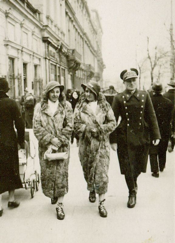 | Nr. inwentarzowy: MŁJ-XVI 1757 / 00 / 011 opis: Warszawską ulicą idą od lewej: Wanda Bohdanowicz, Anna Leska, por. Tadeusz Sokołowski. Kobiety w kapeluszach i futrach (Wanda niesie zawiniątko), porucznik w mundurze.data: kwiecień 1934 r.czas powstania - daty graniczne: 1934-04-01 - 1934-04-30miejsce: Warszawaosoby: Wanda Bohdanowicz zd. Leska 1908-1991 (córka Juliusza Leskiego i Marii zd. Olszyńskiej, żona Michała Bohdanowicza, siostra Anny); Anna Leska 1910-1998 ("Anka", siostra Wandy, później Leska-Daab, podczas II wojny światowej pilot w Wielkiej Brytanii), por. Tadeusz Sokołowski 1905-1943 (1 p.sz., jeździec klasy międzynarodowej, późniejszy olimpijczyk z Berlina, zamordowany przez Gestapo w Mińsku).tworzywo: papier fotograficzny, półbłyszczącytechnika: odbitka żelatynowo-srebrowa DOP, czarno-białazespół: album rodziny Bohdanowiczówwymiary (wys. x szer.): 84 x 60 [mm]