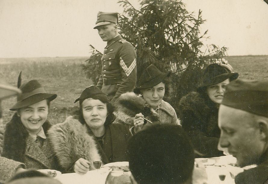 | Nr. inwentarzowy: MŁJ-XVI 1629 / 00 / 012 opis: Bieg myśliwski, przy nakrytym obrusem stole na świeżym powietrzu siedzi, je i pije alkohol kilka pań. Przodem do widza cztery (w ciepłych płaszczach, kapelusikach, kołnierzach z lisa. Na skraju hr. Andrzej Potocki. Z tyłu, na tle choinki plutonowy z szewronem na rękawie.czas powstania - daty graniczne: 1938-01-01 - 1938-12-31miejsce: okolice Hrubieszowaosoby: hr. Andrzej Potockitworzywo: papier fotograficzny, półbłyszczący, Agfa-Gevaerttechnika: odbitka żelatynowo-srebrowa DOP, czarno-białazespół: album rodziny Grotthuswymiary (wys. x szer.): 60 x 81 [mm]