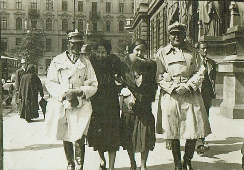 | Nr. inwentarzowy: MŁJ-XVI 1756 / 01 / 009 opis: Warszawską ulicą idą (od lewej): por. Michał Bohdanowicz, jego szwagierka Anna Leska, żona Michała i siostra Anny Wanda Bohdanowicz, mjr Franciszek Haberek. Kobiety w ciemnych strojach, wojskowi w jasnych płaszczach na mundurach. data: maj 1933 r.czas powstania - daty graniczne: 1933-05-01 - 1933-05-31miejsce: Warszawaosoby: Por. Michał Bohdanowicz 1903-48 (w l. 1932-36 w 4 Pułku Ułanów Zaniemeńskich, nazywany "Misiem"); Anna Leska 1910-1998 ("Anka", później Leska-Daab); Wanda Bohdanowicz 1908-1991 (z domu Leska); mjr Franciszek Antoni Haberek 1895-1973 (pilot lotnictwa WP).tworzywo: papier fotograficzny, półbłyszczącytechnika: odbitka żelatynowo-srebrowa DOP, czarno-białazespół: album rodziny Bohdanowiczówwymiary (wys. x szer.): 26 x 36 [mm]