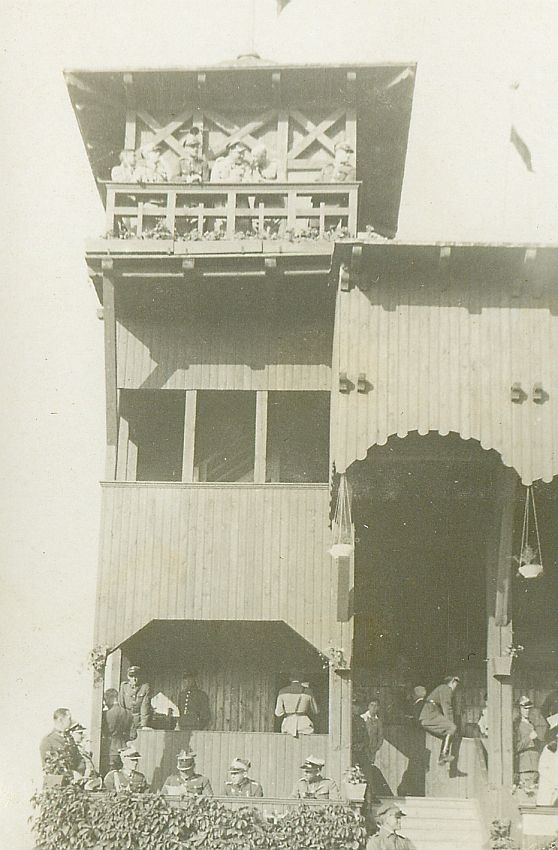 | Nr. inwentarzowy: MŁJ-XVI 1756 / 03 / 028 opis: Tor wyścigów konnych - trybuna jury i fragment trybuny dla publiczności. W obu widać głównie oficerów.data: miting wyścigowy w Baranowiczachczas powstania - daty graniczne: 1933-06-25 - 1933-07-06miejsce: Baranowiczetworzywo: papier fotograficzny, półbłyszczącytechnika: odbitka żelatynowo-srebrowa DOP, czarno-białazespół: album rodziny Bohdanowiczówwymiary (wys. x szer.): 86 x 57 [mm]