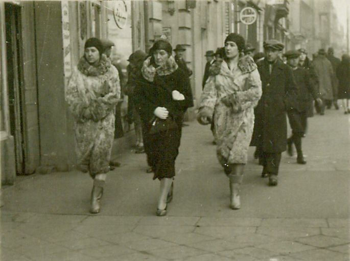 | Nr. inwentarzowy: MŁJ-XVI 1753 / 00 / 096 opis: Warszawska ulica, wielu przechodniów. Na pierwszym planie (od lewej): Wanda Leska, Maria Leska, Anna Leska. Siostry Wanda i Anna w futrach, kozakach, ciemnych toczkach na głowach. Idąca w środku ich matka Maria w ciemnym płaszczu z futrzanym kołnierzem, pantoflach. Fotografia w dokładnie tym samym miejscu co 1753/00/095.data: marzec 1930 r.czas powstania - daty graniczne: 1930-03-01 - 1930-03-31miejsce: Warszawaosoby: Wanda Leska 1908-1991 (córka Juliusza Leskiego i Marii zd. Olszyńskiej, siostra Anny i Kazimierza; później żona Michała Bohdanowicza); Maria Leska 1886-1949 (zd. Olszyńska, matka Wandy, Anny i Kazimierza); Anna Leska 1910-1998 ("Anka", córka Juliusza Leskiego i Marii zd. Olszyńskiej, siostra Wandy i Kazimierza; później żona Mieczysława Daaba, podczas II wojny światowej pilot w Wielkiej Brytaniitworzywo: papier fotograficzny, półmatowytechnika: odbitka żelatynowo-srebrowa DOP, czarno-białazespół: album rodziny Bohdanowiczówwymiary (wys. x szer.): 50 x 63 [mm]