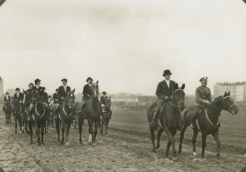 | Nr. inwentarzowy: MŁJ-XVI 1745 / 00 / 034 opis: Bieg myśliwski Klubu Sportowego Rodziny Wojskowej – wyjazd lub powrót. Droga przez trawiasty teren, w tle budynki. Konno, stępem jedzie grupa kilkunastu osób. W pierwszej parze cywil w stroju jeździeckim (na głowie melonik) i oficer w mundurze. Za nimi rojem jadą kobiety - ciemne fraki, marynarki, białe bluzki z ciemnymi krawatami, ciemne nakrycia głowy - najczęściej meloniki, bryczesy, wysokie buty.czas powstania - daty graniczne: 1931-10-25 - 1931-10-25miejsce: Warszawainne nazwy własne: K.S.R.W.tworzywo: papier fotograficzny, półmatowytechnika: odbitka żelatynowo-srebrowa DOP, czarno-białaautor: Pikiel Witold (1895-1943) fotoreporter wojskowy i rządowyzespół: album rodziny Leskichwymiary (wys. x szer.): 125 x 174 [mm]