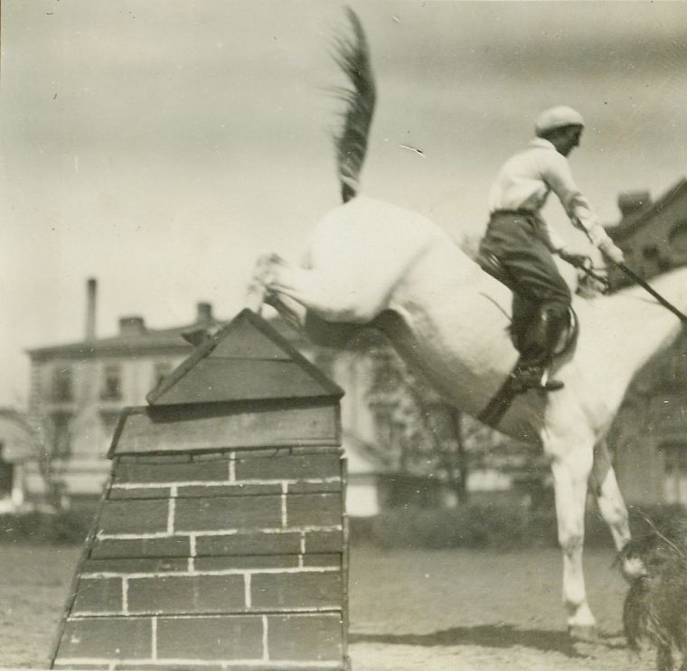 | Nr. inwentarzowy: MŁJ-XVI 1743 / 00 / 004 opis: Prawdopodobnie Anna Leska w skoku na koniu Feliks, trening. Amazonka w jasnym berecie i bluzce, ciemnych bryczesach i długich butach z ostrogami. Faza lądowania po skoku przez przeszkodę (mur) na siwym koniu ("obcięty" łeb). Plac treningowy, w tle budynki.czas powstania - daty graniczne: 1930-05-01 - 1930-05-31miejsce: Warszawa, ul. Koszykowa 79, Wyższa Szkoła Wojenna, ujeżdżalniaosoby: Prawdopodobnie Anna Leska, po mężu Daab (1910-1998).inne nazwy własne: W.S.W - WSW - W.S.Woj. - Wyższa Szkoła Wojennatworzywo: papier fotograficzny, błyszczącytechnika: odbitka żelatynowo-srebrowa DOP, czarno-białazespół: album rodziny Leskichwymiary (wys. x szer.): 89 x 88 [mm] Koń: 1. Feliks, maść siwa - koń, na którym w 1930 roku trenowała i wystartowała w Warszawie (Łazienki) Anna Leska