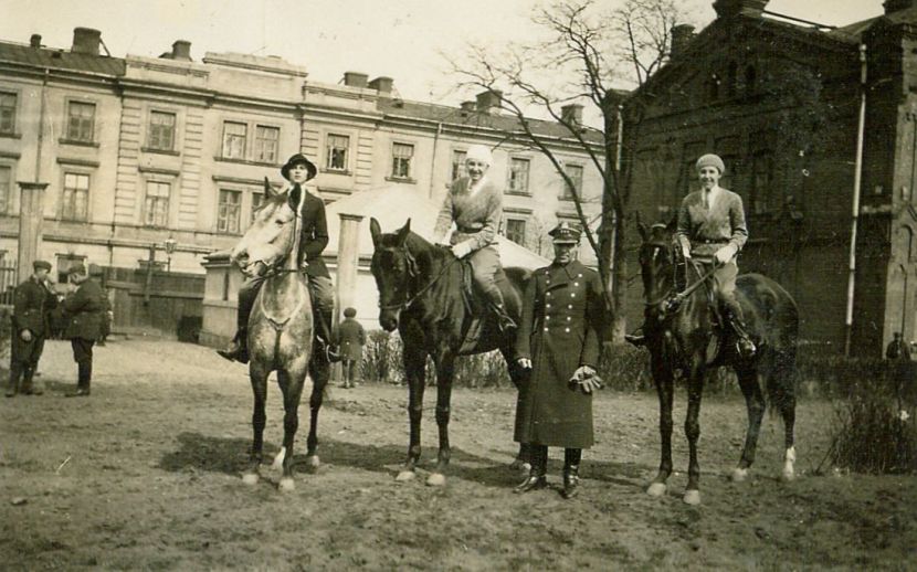 | Nr. inwentarzowy: MŁJ-XVI 1753 / 00 / 115 opis: Na placu do zdjęcia pozują jeźdźcy trenujący na ujeżdżalni Wyższej Szkoły Wojennej. Od lewej: Hanna Gajewska na klaczy Isurja, Anna Leska na klaczy Pani, rtm. Wilhelm Lewicki (pieszo, w mundurze), Wanda Leska na koniu Kazik. Kobiety w strojach jeździeckich. Z tyłu inne osoby, w tle ogrodzenia, zabudowania.data: kwiecień 1930 r.czas powstania - daty graniczne: 1930-04-01 - 1930-04-30miejsce: Warszawa, ul. Koszykowa 79, Wyższa Szkoła Wojenna, ujeżdżalnia położona w kwartale: Koszykowa – Krzywickiego/Sucha – 6 Sierpnia/Nowowiejska – Topolowa/Al. Niepodległościosoby: Hanna Gajewska; Anna Leska 1910-1998 ("Anka", członkini K.S.R.W.; później Leska-Daab, podczas II wojny światowej pilot w Wielkiej Brytanii); Wanda Leska 1908-1991 (siostra Anny i Kazimierza, później żona Michała Bohdanowicza); rtm. Wilhelm Rogala-Lewicki 1898-1992 Londyn ("Wil", jeździec klasy międzynarodowej, w 1929 r. reprezentował w konkursach W.S.W. - był w niej głównym instruktorem jazdy konnej).inne nazwy własne: W.S.W - WSW - W.S.Woj. - Wyższa Szkoła Wojennatworzywo: papier fotograficzny, błyszczącytechnika: odbitka żelatynowo-srebrowa DOP, czarno-białazespół: album rodziny Bohdanowiczówwymiary (wys. x szer.): 48 x 75 [mm] Konie: 1. Issurja (Isurja), klacz, maść siwa - koń, na którym w 1930 r. w W.S.Woj. trenowali rtm. Małochleb i Hanna Gajewska 2. Pani, klacz, maść gniada, ur. 1923 - hod. NN, wł. M.S.Wojsk, 2 szw. pion.; w 1930 r. trenował na niej W. Lewicki w W.S.Woj. 3. Kazik, wałach, maść skarogniada, ur. 1925 - Rock-Roy – Merilla, hod. H. Jechalskiego, wł. Wandy Leskiej-Bohdanowicz; w 1930 roku właścicielka trenowała go na ujeżdżalni W.S.Woj., startowała na nim m.in. w Warszawie, podczas Krajowych Zawodów Konnych w 1932 r.; w 1933 r. wygrywali na nim biegi przełajowe M. Bohdanowicz i J. Domański. W 1937 r. startował w Grudziądzu i Gnieźnie