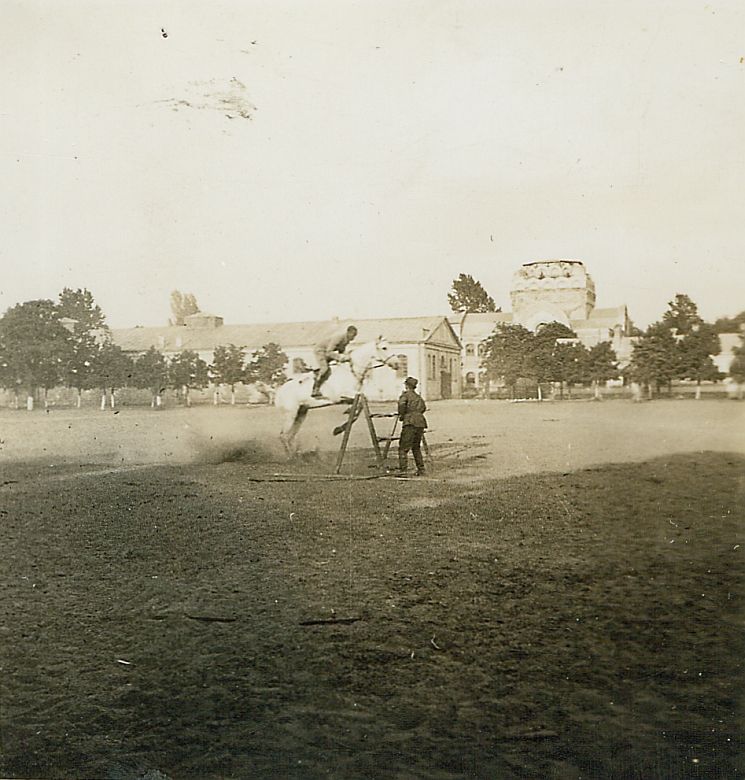 | Nr. inwentarzowy: MŁJ-XVI 1744 / 00 / 090 opis: Duży, piaszczysty plac. Przez przeszkodę o wąskim froncie (stojaki w kształcie odwróconego "V") skacze na siwym koniu The Hoop por. Henryk Roycewicz (z gołą głową). Obok stoi żołnierz, dalej pobielone drzewa, kryta ujeżdżalnia, b. cerkiew pw. św. Olgi.data: liście na drzewach - nie jest to zimaczas powstania - daty graniczne: 1931-03-01 - 1931-10-31miejsce: Warszawa, ujeżdżalnia 1 Dywizjonu Artylerii Konnejosoby: por. Henryk Leliwa-Roycewicz (1898-1990) 25 p.u., olimpijczyk z Berlina 1936 (WKKW - srebrny medal drużynowo).inne nazwy własne: 1 DAK, 1 D.A.K., 1 Dywizjon Artylerii Konnej, Rojcewicztworzywo: papier fotograficzny, błyszczącytechnika: odbitka żelatynowo-srebrowa DOP, czarno-białazespół: album rodziny Leskichwymiary (wys. x szer.): 59 x 57 [mm] Koń: 1. The Hoop, klacz, maść siwa, ur. 1923 - hod. Irlandia, wł. H. Roycewicza, w 1931 r. 2. miejsce w MP w skokach (Roycewicz), na zdjęciu: 9 lat
