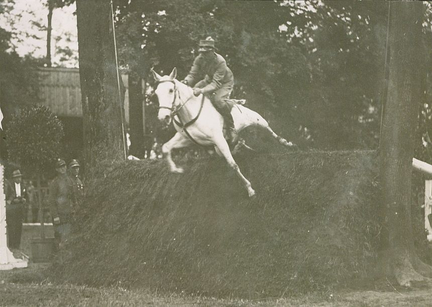 | Nr. inwentarzowy: MŁJ-XVI 1744 / 00 / 078 opis: Międzynarodowe i Krajowe Konkursy Hipiczne w Łazienkach. Szwajcar por. Simmen na siwym koniu Secretaire z trudnościami pokonuje stałą przeszkodę. Koń traci równowagę na szczycie włoskiej górki. Obok stoją żołnierze i cywil, w tle trybuny, drzewa.czas powstania - daty graniczne: 1931-05-28 - 1931-06-08miejsce: Warszawa, hipodrom w Łazienkachosoby: Szwajcar por. Simmeninne nazwy własne: Lt. Simmen, Leutnant Simmentworzywo: papier fotograficzny, błyszczącytechnika: odbitka żelatynowo-srebrowa DOP, czarno-białazespół: album rodziny Leskichwymiary (wys. x szer.): 103 x 146 [mm] Koń: 1. Secretaire, maść siwa - koń, na którym startował Simmen