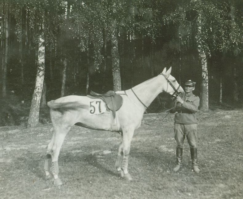 | Nr. inwentarzowy: MŁJ-XVI 1753 / 00 / 024 opis: Letnie konkursy hipiczne. Siwą klacz The Hoop prezentuje żołnierz, prawdopodobnie luzak por. Henryka Roycewicza. Koń osiodłany, siodło skokowe, na potniku numer 57. data: zawody rozpoczęto 21 lipcaczas powstania - daty graniczne: 1929-07-21 - 1929-07-31miejsce: Gdynia, Polana Redłowskaosoby: Niewidoczny na zdjęciu właściciel i jeździec klaczy The Hoop: Por. Henryk Leliwa-Roycewicz 1898-1990 (Rojcewicz, 25 p.u., olimpijczyk z Berlina 1936 - WKKW - srebrny medal drużynowo)inne nazwy własne: Polanka Redłowskatworzywo: papier fotograficzny, błyszczącytechnika: odbitka żelatynowo-srebrowa DOP, czarno-białazespół: album rodziny Bohdanowiczówwymiary (wys. x szer.): 85 x 101 [mm] Koń: 1. The Hoop, klacz, maść siwa, ur. 1923 - hod. Irlandia, wł. H. Roycewicza, w 1931 r. 2. miejsce w MP w skokach (Roycewicz), na zdjęciu: w Gdyni w 1929 r. por. Roycewicz startował na The Hoop w kilku konkursach
